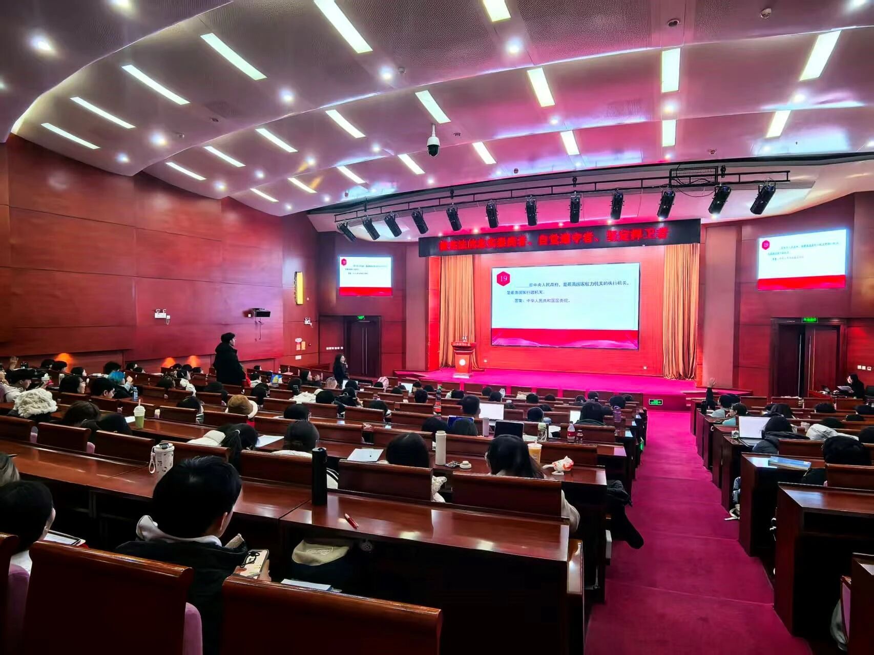 2025年12月4日晚,“做宪法的忠实崇尚者、自觉遵守者、坚定捍卫者”专题讲座在逸夫报告厅顺利举行,马克思主义学院孙迎春副教授为同学们讲授了一堂有温度、有深度的宪法教育课。第4期“桐语先锋”本科生骨干党员培训班全体学员、第26期“青语”团校暨青马工程培训班部分学员及各学院新生代表参加。