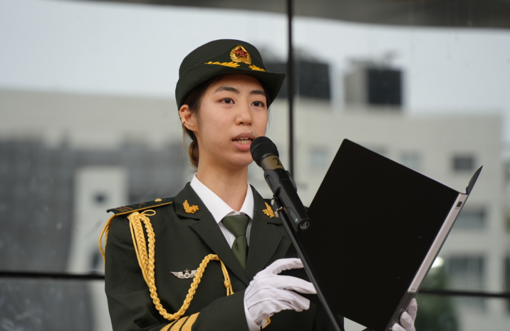 教师教育学院2024级汉语国际教育专业于慧馨同学代表参训学员发言。她表示,在纪念抗战胜利80周年的特殊时刻,参加军训不仅是锤炼意志的实践,更是接受国防教育、传承抗战精神、履行国防义务的责任担当。作为校国旗护卫队成员,她表示国旗护卫队将率先垂范。她代表全体参训同学做出四点承诺:坚定信念,厚植爱国情怀;令行禁止,严守纪律规范;刻苦训练,磨砺顽强意志;团结协作,弘扬集体精神。