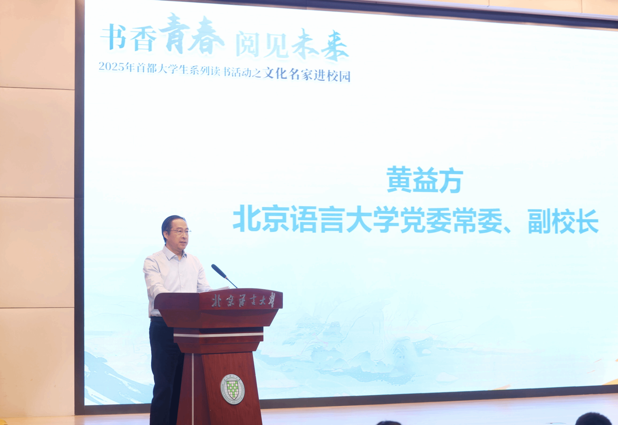 黄益方副校长在致辞中表示,北京语言大学作为以传播中国语言文化为主要使命的国际型大学,建校至今,已为世界189个国家和地区培养了30万余名校友。遍布全球的分支机构和校友,为传承中华优秀文化、促进文明交流互鉴做出了重要贡献。近年来,学校高度重视“书香校园”建设,通过打造“读书实践周”“语图悦读汇”“师生读书会”“晨读北语”等特色活动,构建起了“书香北语”品牌矩阵。通过多元化的阅读推广模式,培养同学们爱读书、读好书、善读书的良好习惯,让书香浸润校园每个角落。他希望同学们做“文化传承的践行者”,在阅读和写作中汲取智慧,在文化的沃土上孕育理想,在文字中遇见自我、洞见世界,在思考中启迪美好未来。
