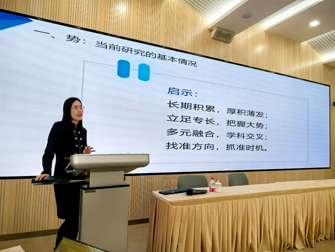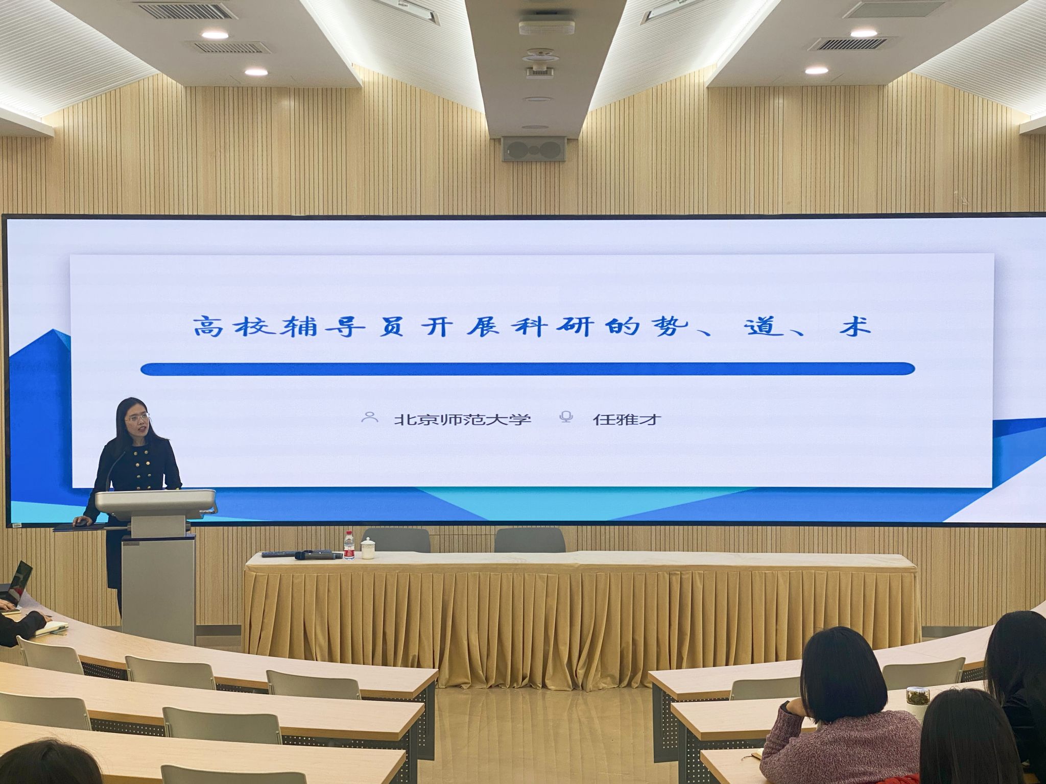 任雅才老师以“高校辅导员开展科研的势、道、术”为题,从辅导员开展科研的概况、方法、重点三个角度入手,讲解了辅导员开展科研工作的重要性,并为老师们提供了具体方法指导。