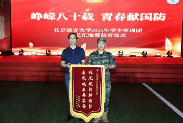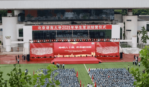 北语新闻网8月1日电(通讯员 隋心怡 摄影 魏达 等)七月骄阳淬炼青春底色,猎猎军旗映照赤子丹心。在纪念中国人民抗日战争暨世界反法西斯战争胜利80周年的历史节点上,北京语言大学2025年学生军训团以一场精彩纷呈的军训汇演,致敬峥嵘岁月,礼赞强军时代。7月27日傍晚,“峥嵘八十载 青春献国防”主题结营仪式在田径场隆重举行。党委书记倪海东,党委常委、副校长黄益方,承训部队负责人,党委学工部、武装部部长武玉洲,各学院负责人及军训团全体师生参加仪式。