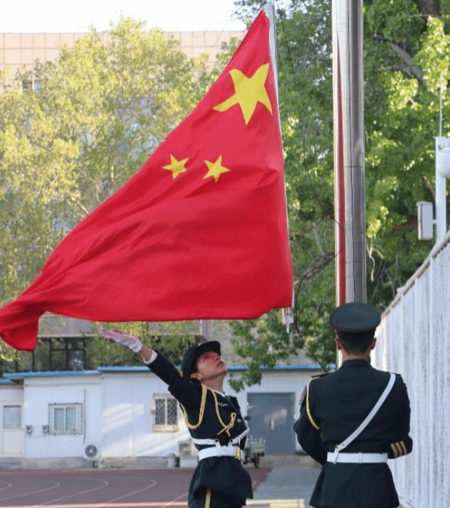 7点30分,升旗仪式准时开始。一轮初升红日映照下,北京语言大学国旗护卫队的队员们礼服笔挺、军姿飒爽,以铿锵有力的正步向升旗台迈进。随着“向国旗敬礼”的口令响起,五星红旗在国歌声中冉冉升起。全体师生庄严行注目礼并高唱国歌,心中激荡深厚的家国情怀。