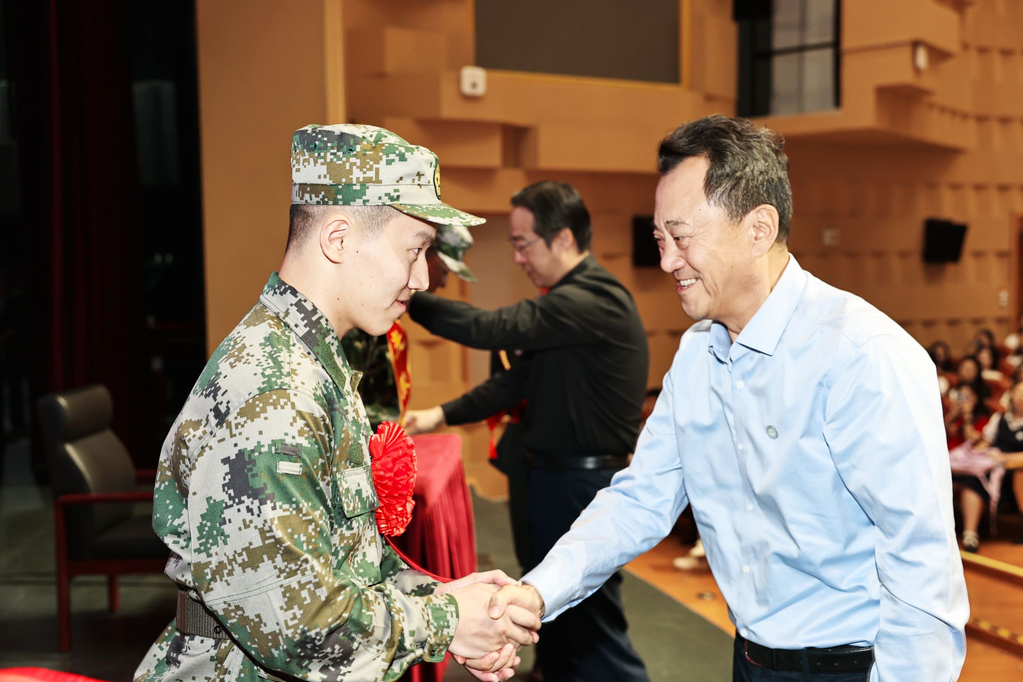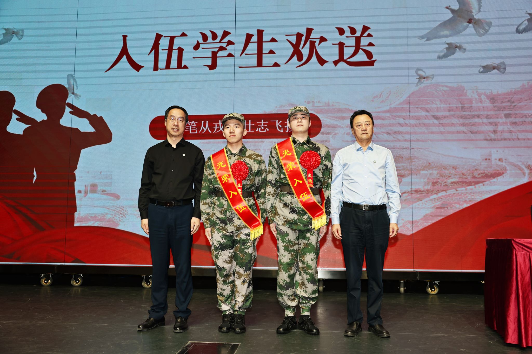 2025年9月,北语六名优秀本科生、研究生光荣参军入伍。12日下午,学校在梧桐会堂隆重举行秋季学子入伍欢送会,倪海东书记、黄益方副校长为入伍大学生士兵代表佩戴大红花及绶带,全体新生共同见证了这一光辉时刻,共祝他们一路顺风,在军营中书写不平凡的青春。