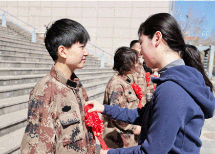 各学院老师为同学们送上了鲜花,期盼同学们光荣平安归来。5名刚刚在今年3月返校的退役学生代表以军人的姿态庄严地为新战士们佩戴光荣花,这是军人之间的交接,是责任与使命的传承。自戴上红花的那一刻起,年轻的战士们就要奔赴新的哨位战位,肩负神圣使命,守护祖国安宁。入伍同学们深受感动,纷纷表达了对家人、老师及学校的感谢与不舍,表示今后一定会牢记使命、不负重托,始终保持军人的本色,为学校争光,为强军兴军伟大事业注入不竭的青春动力。