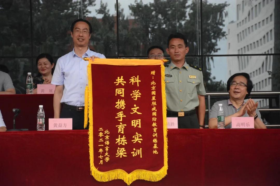 军训的顺利进行离不开军训基地的有力保障和承训教官的辛勤付出,黄益方副校长代表学校向北京国星胜戎国防教育基地夏将胜主任赠送锦旗以表感谢。北语军训团政委、党委学生工作部副部长张洋老师宣读了2021年学生军训嘉奖令,对在本次军训期间素质过硬、作风优良的庄明烨等239名学生给予军训标兵称号表彰,并授予北语军训标兵荣誉勋章。14名军训标兵学生代表列队整齐来到主席台前接受表彰,出席结营仪式的嘉宾领导们为获得表彰的军训标兵学生代表们颁发勋章。获奖同学们胸前的奖章象征的不仅是荣誉,更是这十四天以来汗水的结晶,是漫漫人生路上的里程碑。