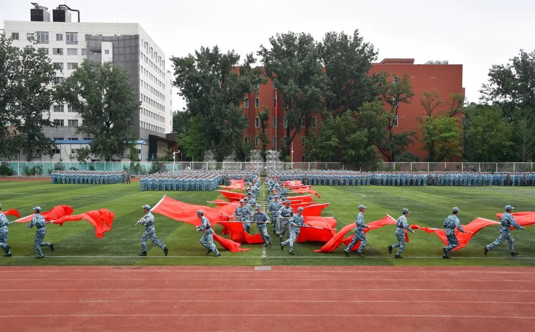 闭营仪式正式开始之前,各连队早已在操场整齐集结列队,进行最后一次联排,同学们以良好的精神面貌迎接最终的检阅。上午九时整,各连队集合并报告完毕,校党委倪海东书记向列队教官下达命令:“开始!”。国旗护卫队在雄壮的国歌声中升起五星红旗,北京语言大学2021年学生军训结营仪式正式拉开帷幕。