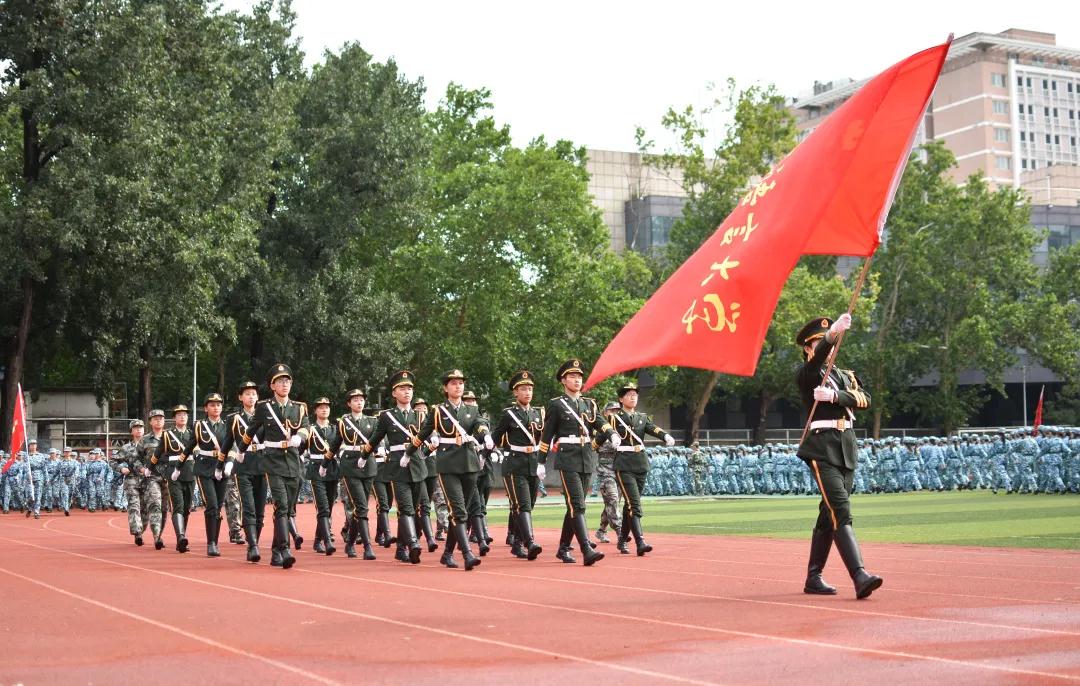 第二项是特色科目展示,由40余名同学组成的旗舞队手持各连队连旗和红旗,从田径场中央迅速达到各自点位,一时间,训练场周围红旗招展,煞是耀眼。