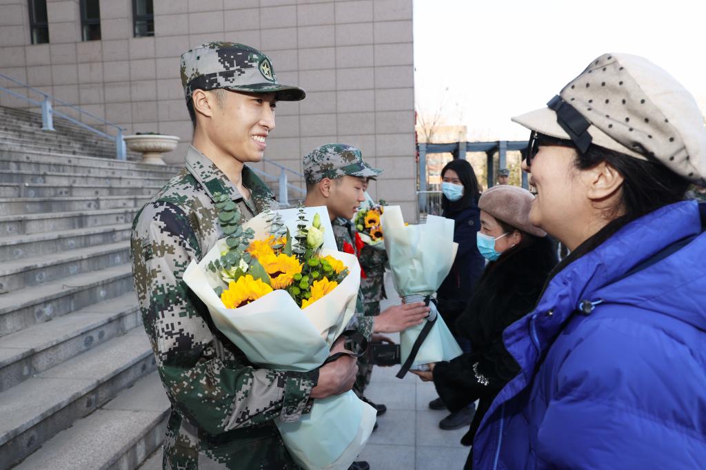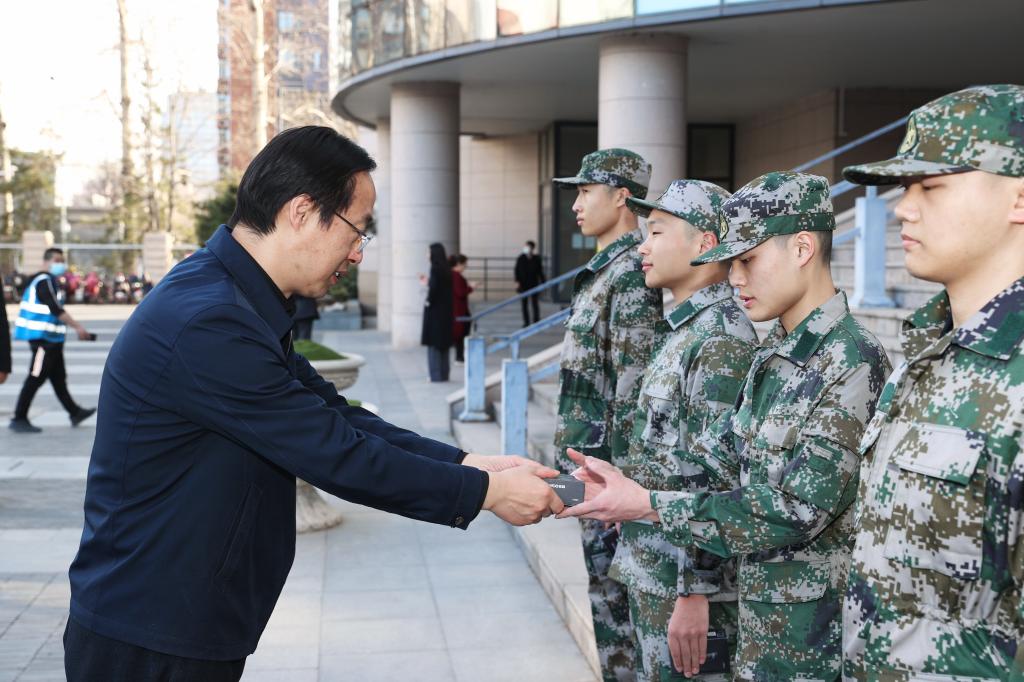 3月3日,校党委常委、副校长黄益方,校武装部部长武玉洲以及有关学院学生工作负责人及辅导员老师在梧桐会堂东侧广场欢送即将参军入伍的同学们。同学们身着戎装,军姿挺拔,展示了北语入伍学生携笔从戎、强军报国的坚定决心。黄益方副校长代表学校向即将入伍的同学们送上入伍慰问品并对大家表示祝贺,勉励他们向北语的退伍大学生士兵学习,要把握人生难得机遇,在军队大熔炉里锤炼忠诚品格、顽强意志和良好的个人作风,早日完成从一名青年学生向合格军人的转变,为自己争光,为家人争光,为学校争光,两年后以崭新的面貌回归校园。在场的各学院学生工作负责人及辅导员老师也都为自己的学生送上了鲜花表示祝贺。北语退伍大学生士兵代表为新战士们佩戴光荣花,新战士们昂首挺胸,目光如炬,“授花”授予的是使命,接过的是责任。从退伍老兵手中戴上红花的那一刻起,年轻的战士们就要奔赴新的哨位战位,肩负起神圣使命,守护无上荣光。大家纷纷表示,今后一定会服从命令、严守纪律,积极上进、刻苦训练,做党和人民的忠诚卫士,为火热的军营注入不竭的青春动力。在即将入伍的同学们出发当天,有不少在校师生自发前来为他们送行,以自己的方式为即将出发的北语学子们送上最真切的祝福。