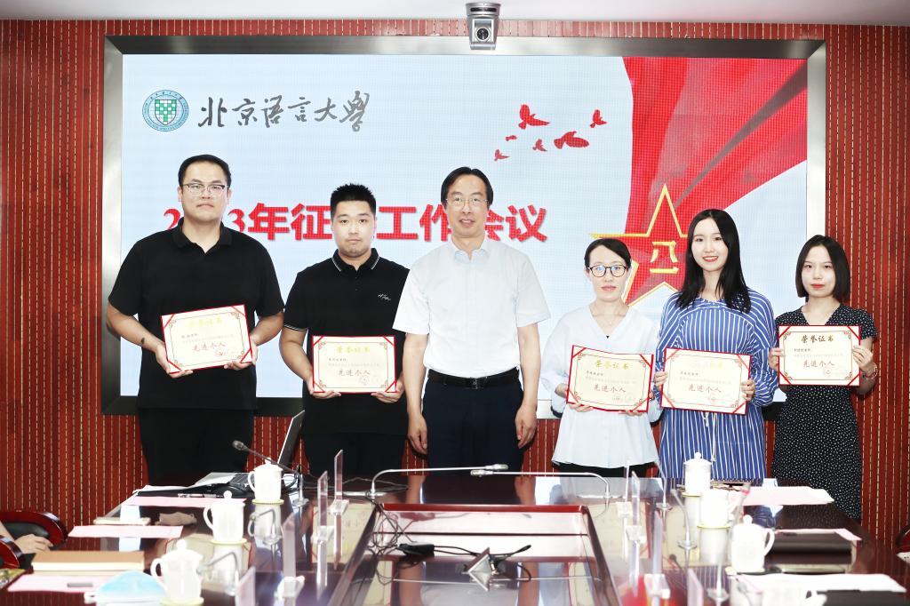 会议最后举行了北京语言大学2023年度征兵工作先进单位及先进个人表彰仪式,倪海东书记为获得“征兵工作先进单位”荣誉称号的外国语学部、商学院、艺术学院、语言康复学院、国际中文教育研究院等五个培养单位颁发证书,黄益方副校长为获得“征兵工作先进个人”荣誉称号的杨柯、刘欣怡、陈思远、李姝姝、李林凤等五名辅导员颁发证书。