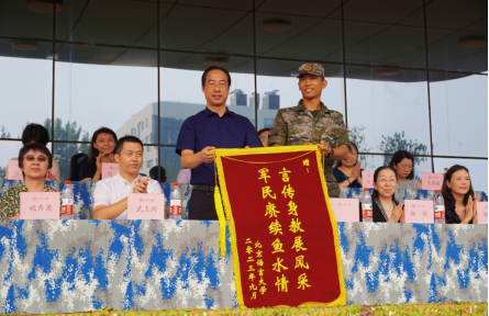 接下来,黄益方副校长代表学校向承训部队赠送锦旗,对承训教官的辛勤付出表示感谢。党委学工部部长、武装部部长武玉洲老师宣读嘉奖令,对在本次军训期间表现优异、作风优良的学生授予“军训标兵”奖章。八名标兵代表整齐列队来到主席台前接受表彰,出席结营仪式的领导老师们为标兵代表颁发奖章。