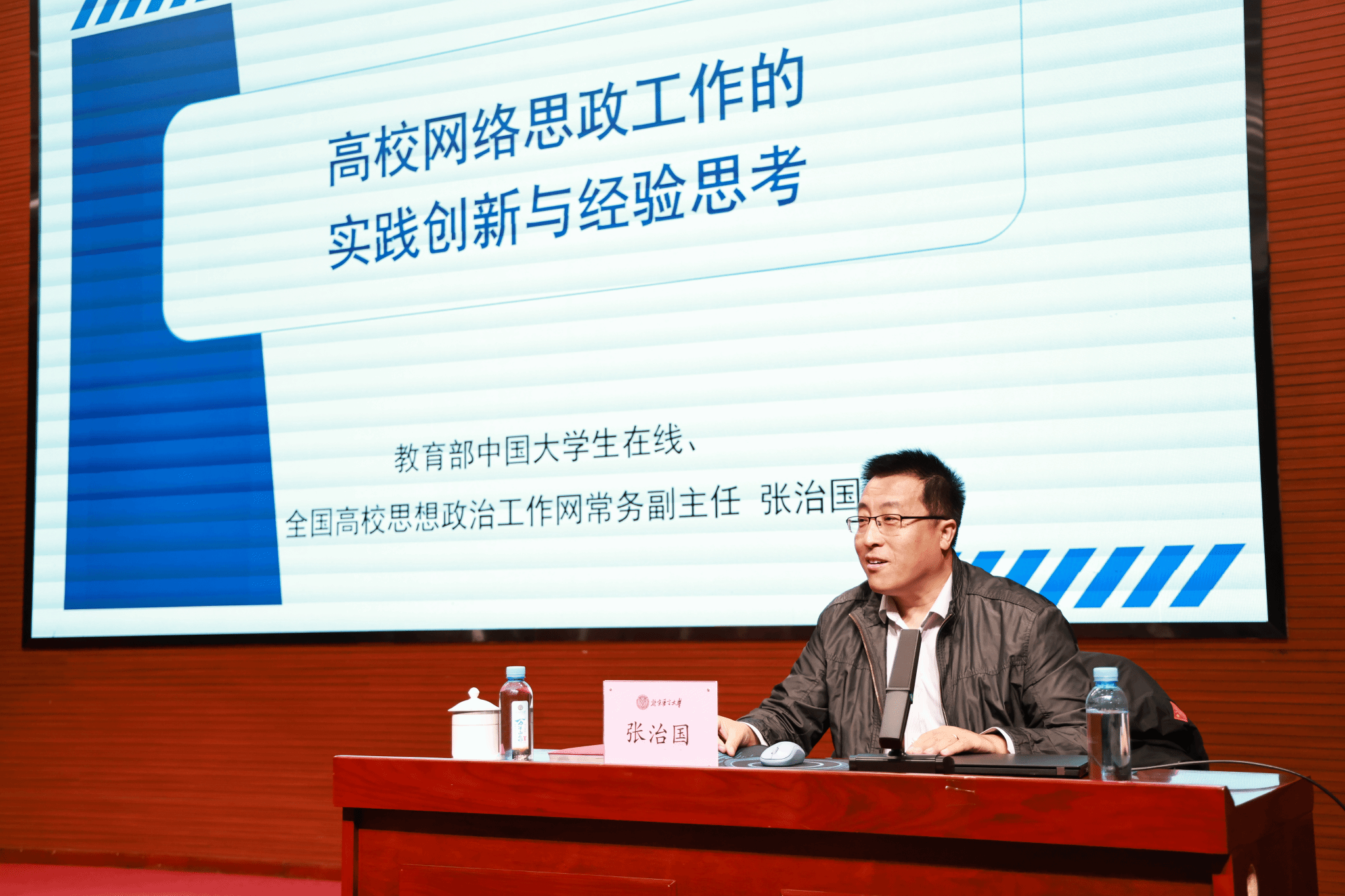 张治国主任以“高校网络思政工作的实践创新与经验思考”为题带来开班第一讲。他结合16年深耕高校思想政治工作一线的丰富经验,特别是带领中国大学生在线、全国高校思想政治工作网发展建设的实践历程,回顾了高校网络思政工作的发展脉络,生动讲述了网络育人载体的迭代升级。报告围绕“明确清晰的平台定位,打造良好的新媒体传播生态”“强化主题活动引领力,‘以点带面’扩大活动传播力”“建强‘小中融媒’工作室,做好学生实习实践的平台”展开,张治国主任通过大量生动案例,深入剖析了当代大学生的认知特点、信息获取习惯和成长困惑,强调育人工作需“信任学生、依靠学生、引导学生、学生参与”,具体到网络思政工作中,要在话语方式、内容形式和互动机制上主动求变,要积极组织学生参与内容生产。他指出,高质量的网络思政工作要坚持线上与线下深度融合,精准对接学生成长需求,增强思想引领的亲和力、针对性与实效性。同时,他还就意识形态安全、内容审核重点、新媒体运营技巧等内容,介绍了相关政策要求与操作规范,为我校辅导员开展网络思政工作和育人工作提供了专业指引。