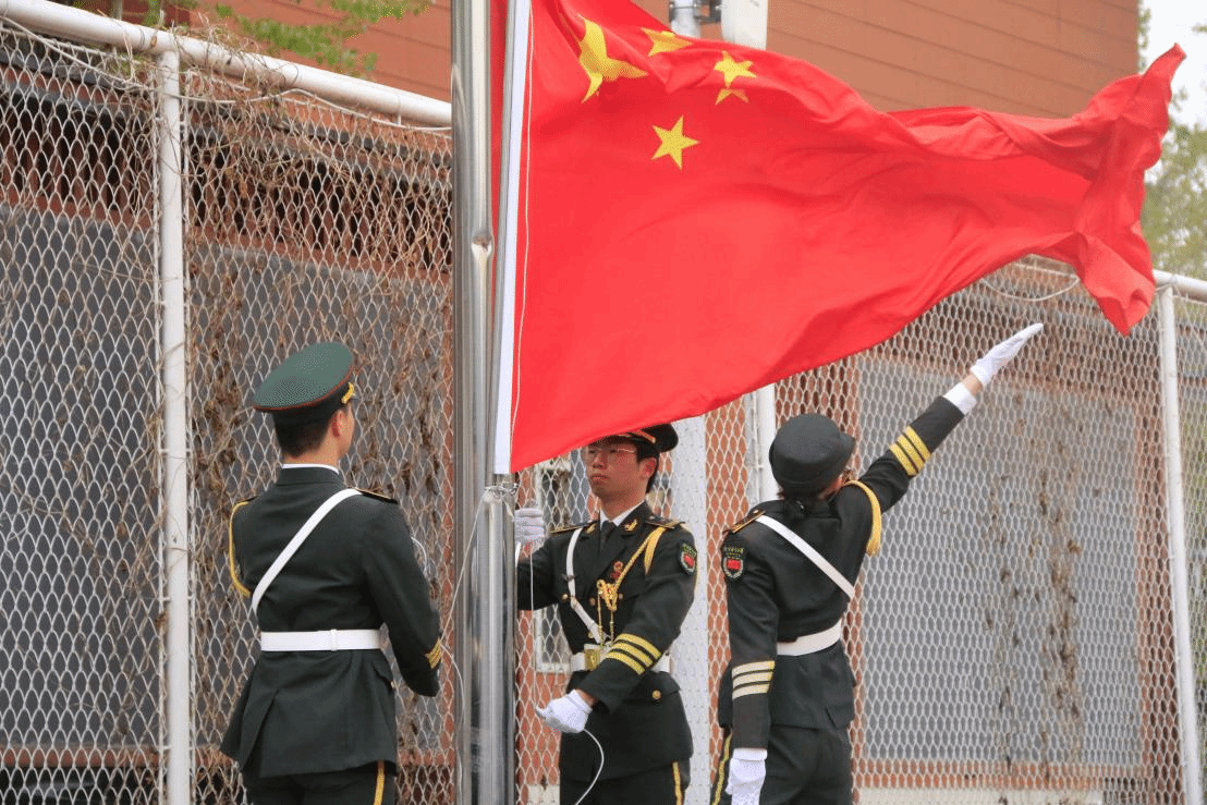 7点25分,升旗仪式准时开始。春风拂面,红旗招展;国家安宁,青年担当。一轮初升红日映照下,北京语言大学国旗护卫队的队员们礼服笔挺、军姿飒爽,以铿锵有力的正步向升旗台迈进。随着“向国旗敬礼”的口令响起,五星红旗在雄壮激昂的国歌声中冉冉升起。全体师生行注目礼并高唱国歌,在这一庄严的时刻共同感悟国家安全对民族复兴、青年成长的重要意义,家国情怀与国家安全意识在心中交融激荡。